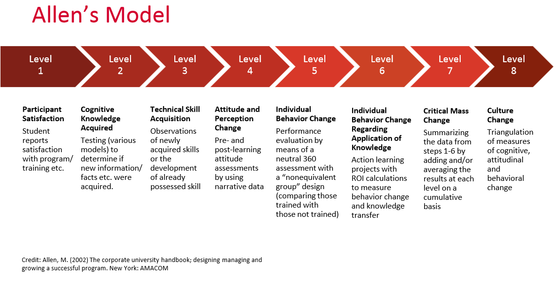 One of the most popular tools is Allen’s Model, which measures the impact of a learning program across eight levels:
